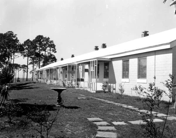 Camp Gordon Johnston, its mission accomplished, closed in 1946, and a year later, Lanark Estates, Inc., a Miami-based development company, purchased some of the land it had occupied. In 1955, plans were drawn for a retirement community on the site, and the sturdy collection of cottages that had previously served as officers’ quarters was converted to low-maintenance row houses.